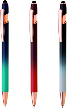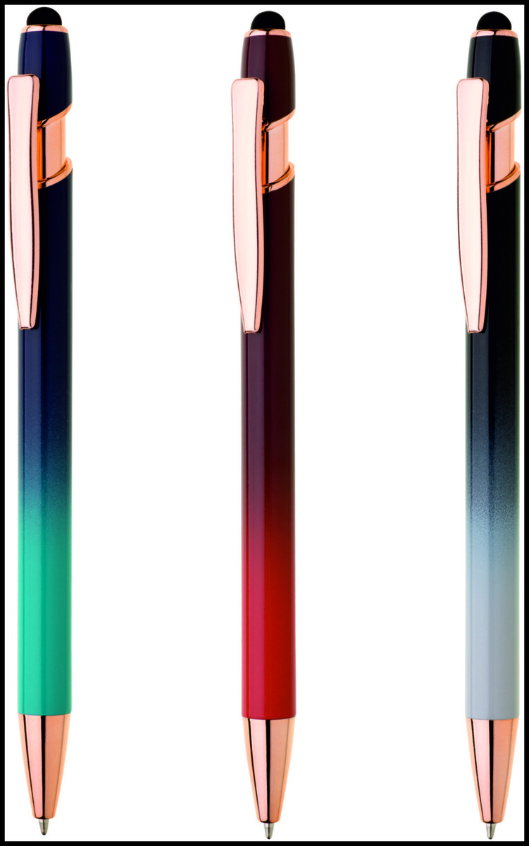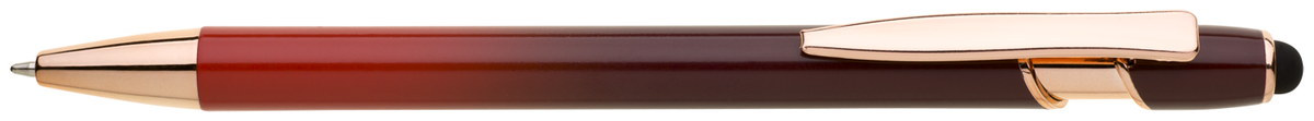 Elegantní kuličkové pero s kovovým tělem v moderním červeno-oranžovém přechodu a detaily z růžového zlata. Na konci má dotykovou část pro ovládání mobilu či tabletu. Výsledný efekt laserového značení je světle stříbrný až bílý. Náplň X-20 modře píšící.