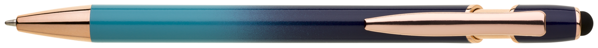 Elegantní kuličkové pero s kovovým tělem v moderním modro-tyrkysovém přechodu a detaily z růžového zlata. Na konci má dotykovou část pro ovládání mobilu či tabletu. Výsledný efekt laserového značení je světle stříbrný až bílý. Náplň X-20 modře píšící.
