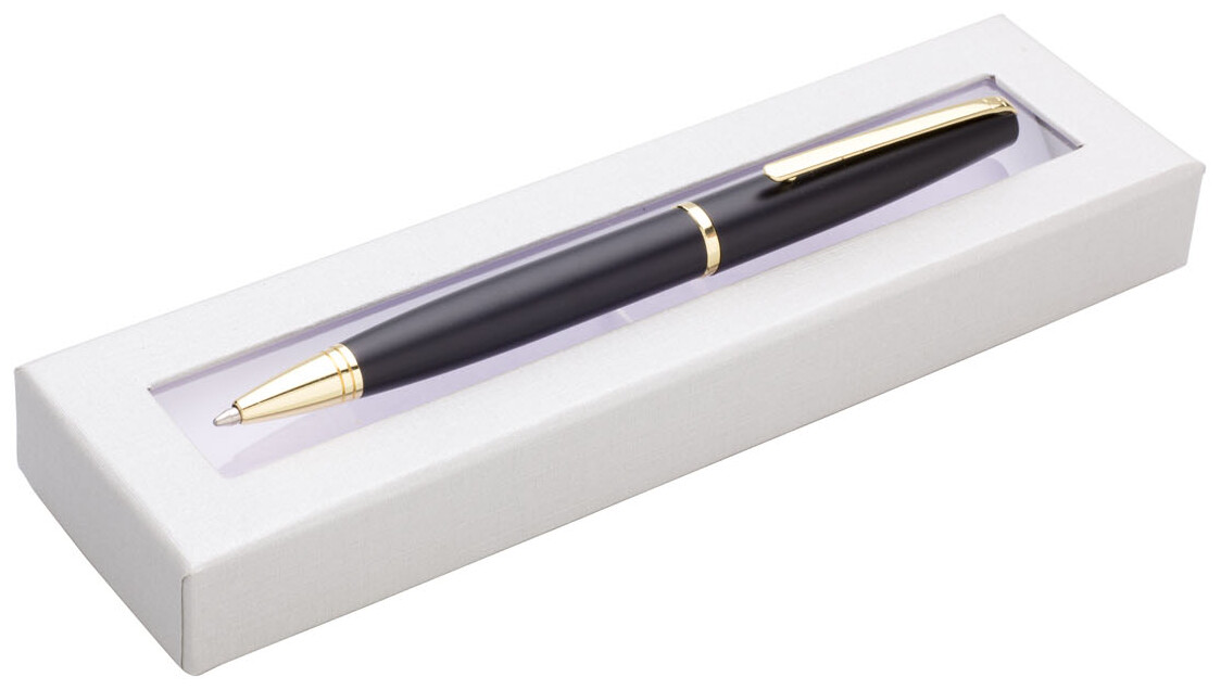 kovová propiska v dárkové krabičce s průhledným okénkem.