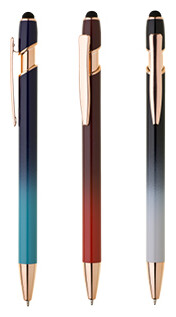 Elegantní kuličkové pero s kovovým tělem v moderním černo-šedivém přechodu a detaily z růžového zlata. Na konci má dotykovou část pro ovládání mobilu či tabletu. Výsledný efekt laserového značení je světle stříbrný až bílý. Náplň X-20 modře píšící.