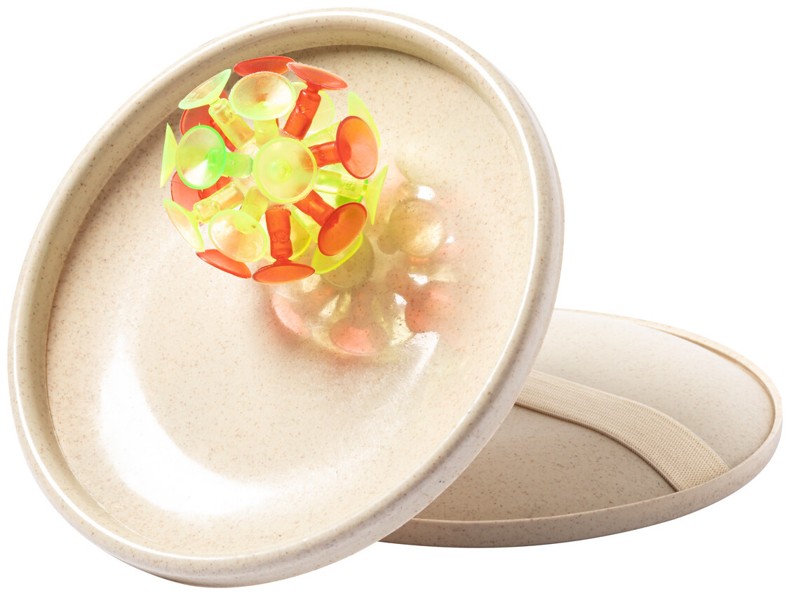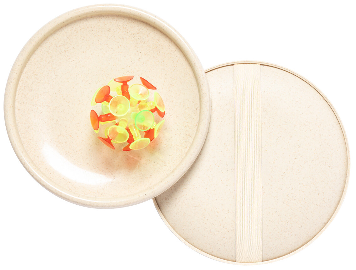 Plážová hra, včetně míčků s přísavkami a plochých pádel z plastu s pšeničnou slámou a elastickým popruhem.