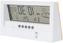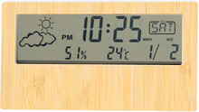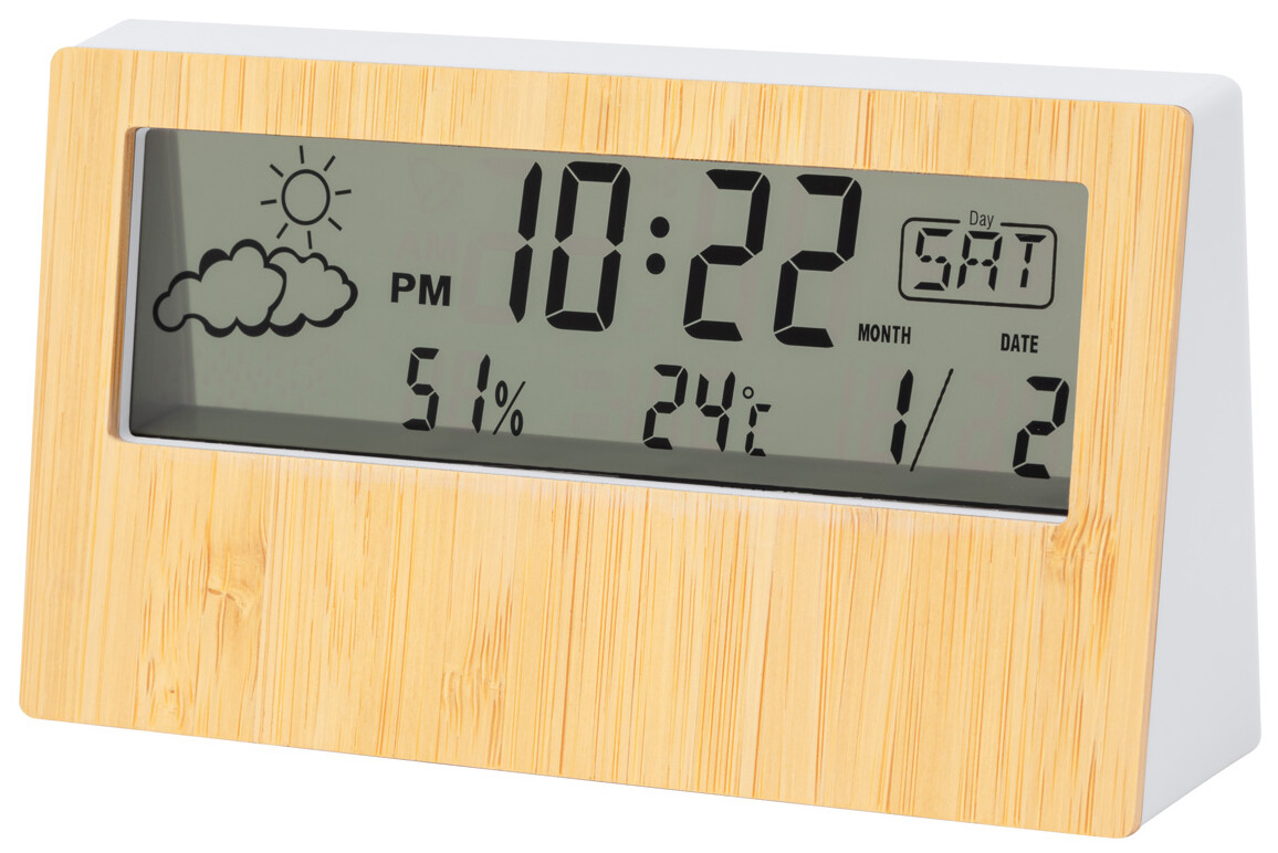 Digitální hodiny a meteostanice z bambusu a ABS plastu s teploměrem a displejem vlhkosti. Funguje na 2 baterie AAA, bez baterií.