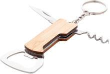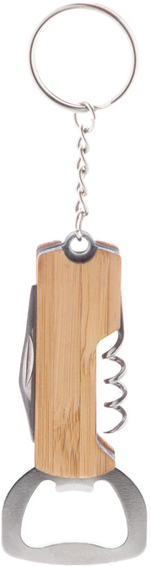Přívěšek na klíče s otvírákem na láhve z bambusu a nerezové oceli s vývrtkou a kapesním nožem.