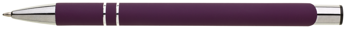 Hliníková propiska se stříbrnými doplňky a měkkým pogumovaným soft povrchem ve fialové barvě. Modře píšící.