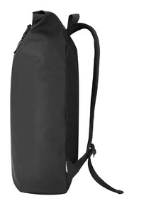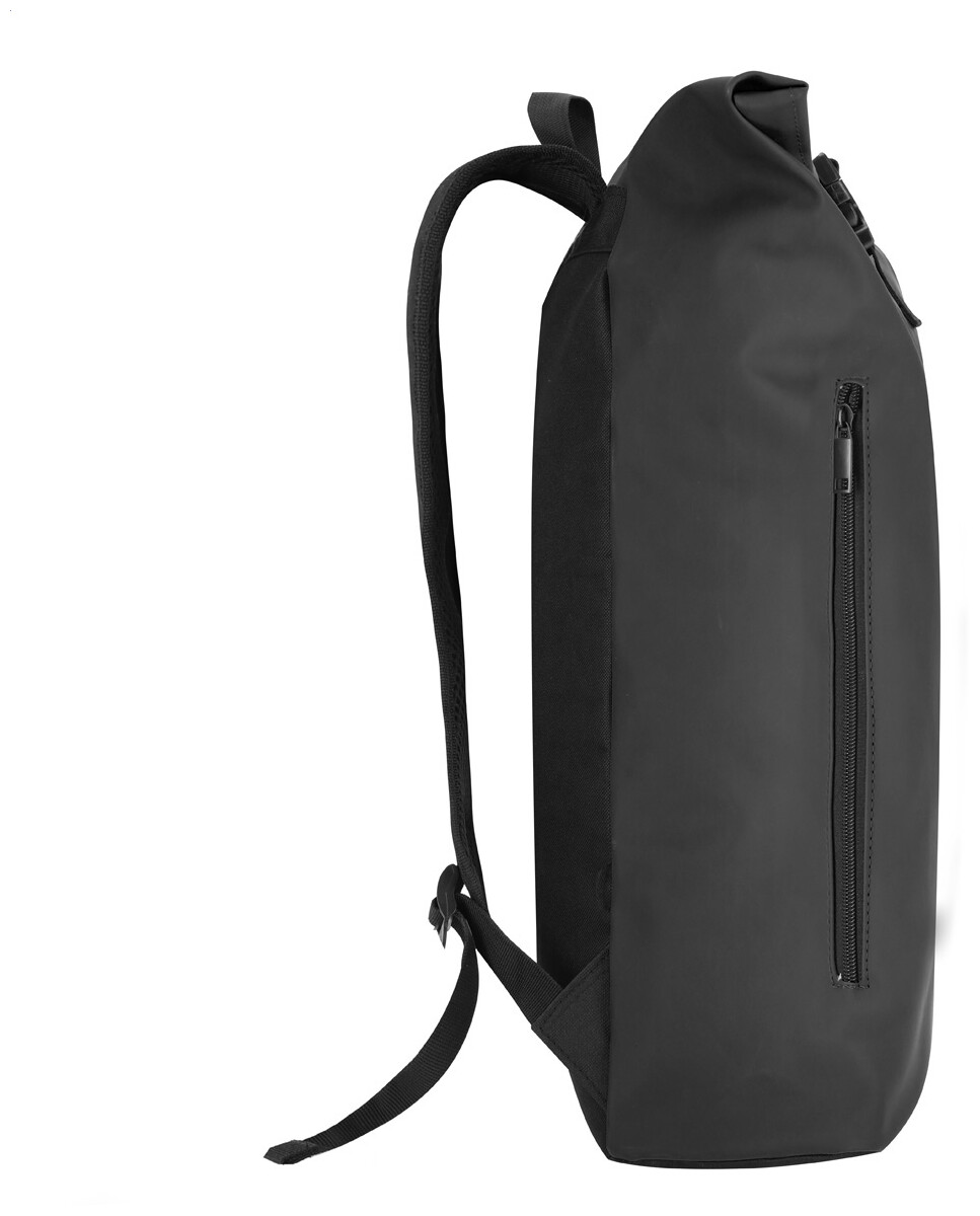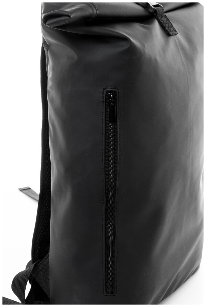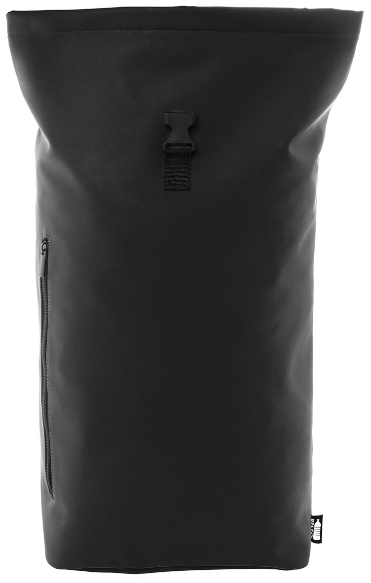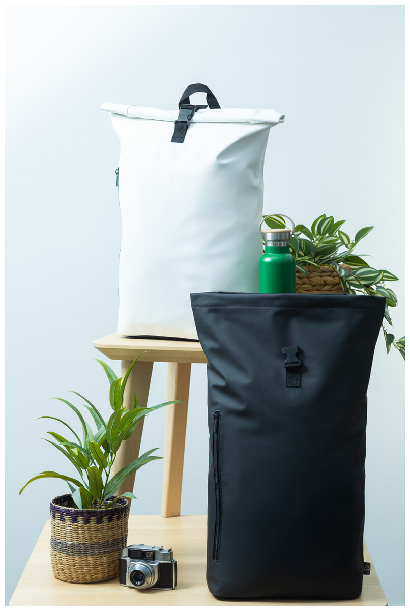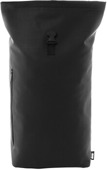 Vodotěsný, měkký rolovací batoh z recyklované PU kůže se zapínáním na přezku, přední kapsou na zip a polstrovanou přihrádkou na notebook (15"). S polstrovanými zády a ramenními popruhy. S výrazným recyklovaným PU štítkem.