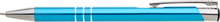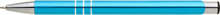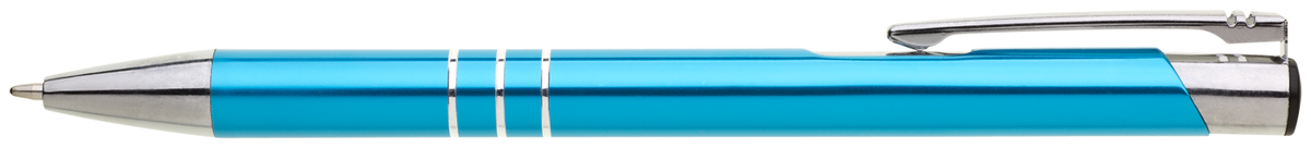 TRIALI hliníková reklamní tužka. Lesklé tyrkysové tělo se třemi stříbrnými proužky a chromovými doplňky.
