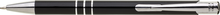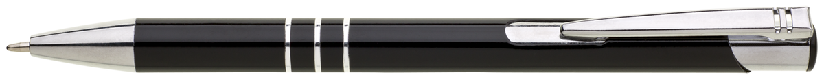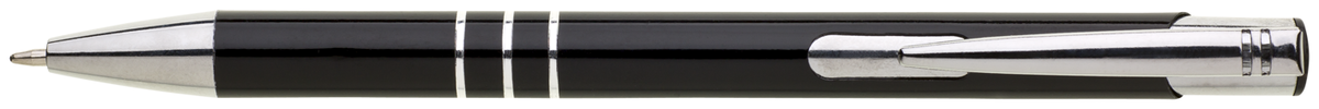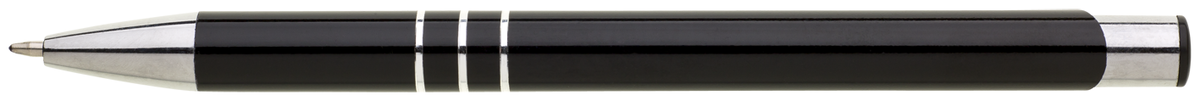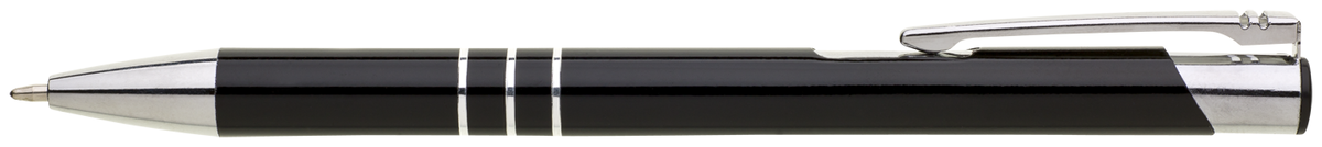 TRIALI hliníková reklamní tužka. Lesklé černé tělo se třemi stříbrnými proužky a chromovými doplňky.Velkoobsahová modrá náplň.
