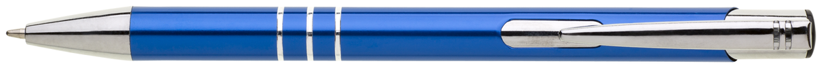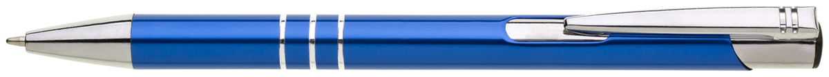 TRIALI hliníková reklamní tužka. Lesklé modré tělo se třemi stříbrnými proužky a chromovými doplňky.