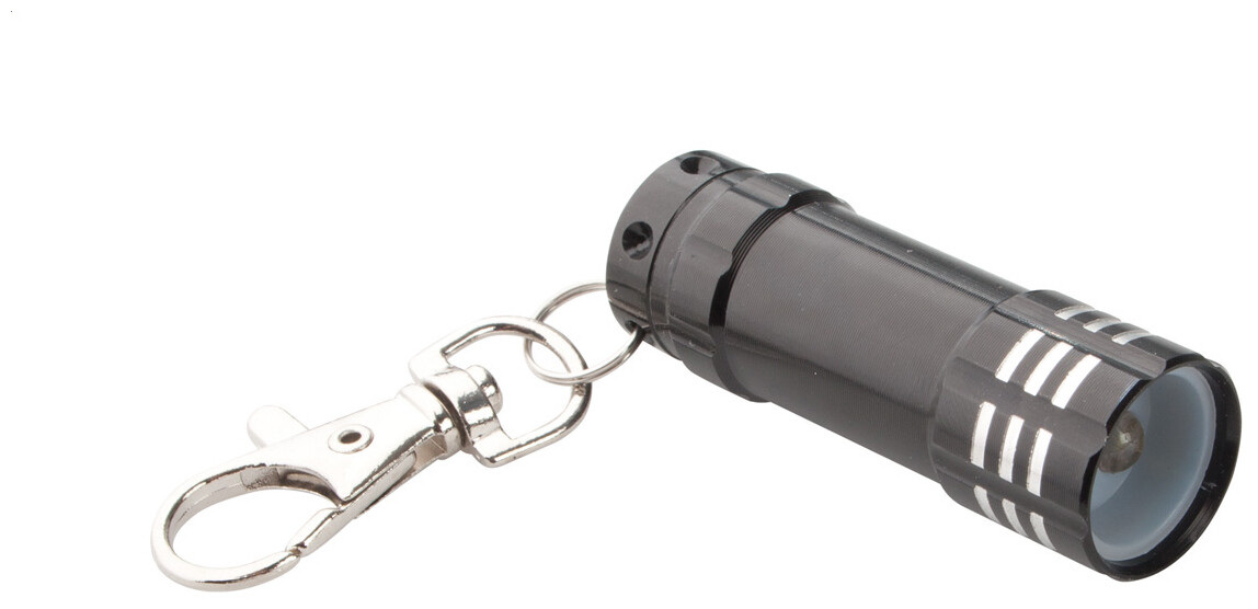 Mini hliníková baterka s 3mi LED diodami a karabinkou. Dodáváno s baterií.