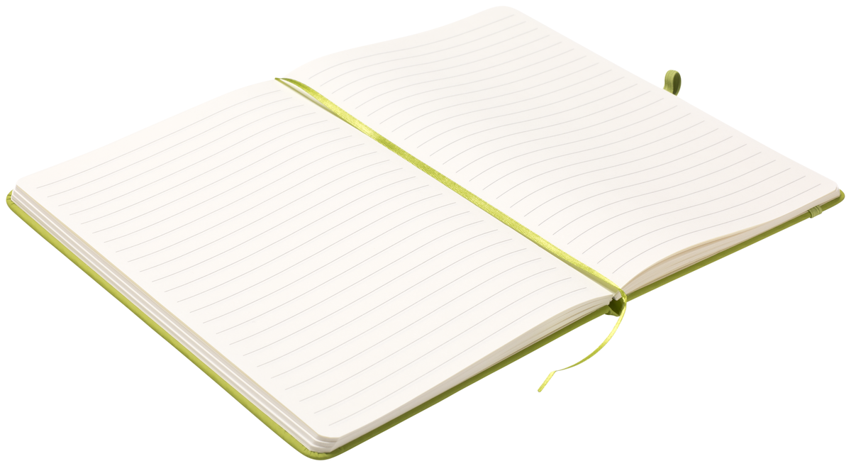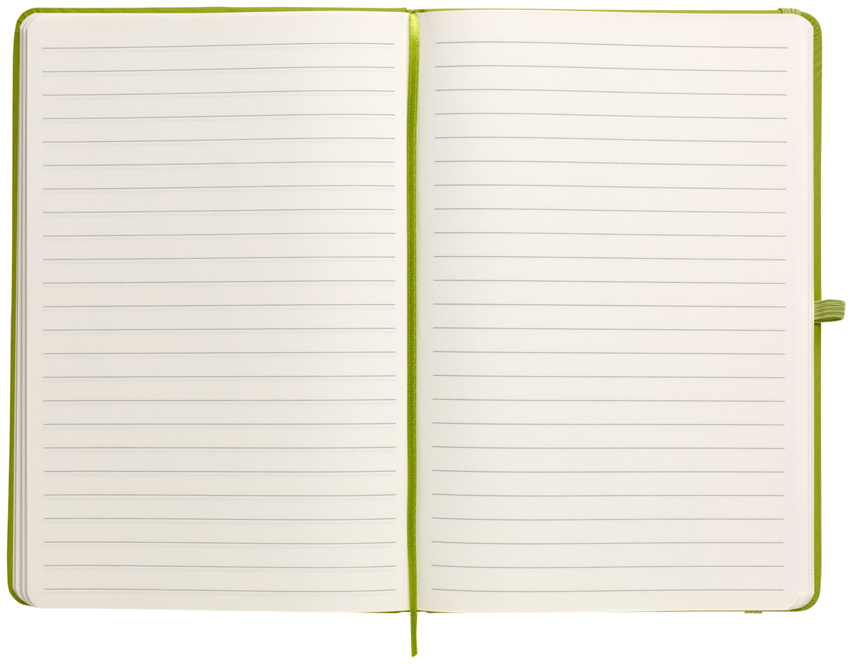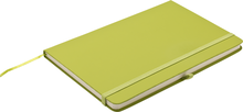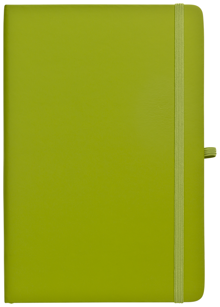 Zápisník A5 v zelených světlých deskách z PU materiálu má 80 linkovaných listů. Blok má uzavírací gumičku, poutko na propisku a textilní záložku v barvě desek.