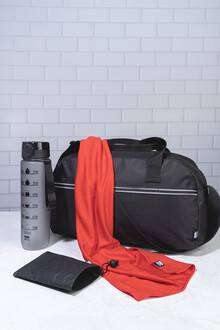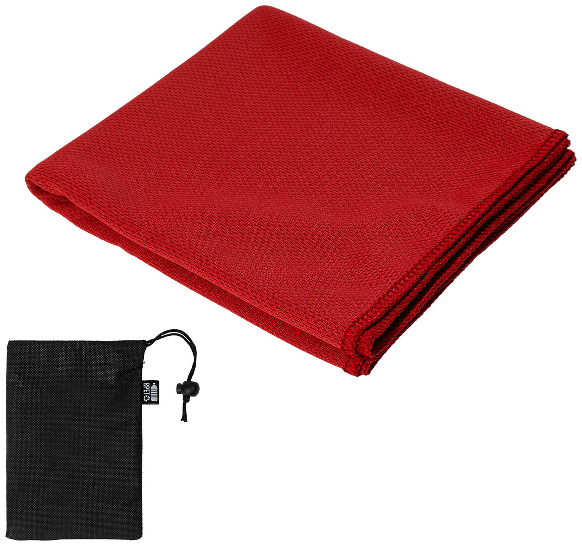 Sportovní ručník z mikrovlákna RPET v přepravním pouzdře z netkané tkaniny RPET s charakteristickou etiketou RPET. Polyester RPET, 140 g/m2.