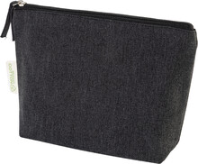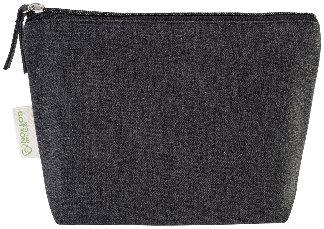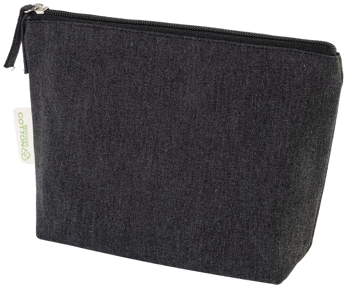 Kosmetická taštička na zip ze 70 % recyklované bavlny a 30 % RPET polyesteru, 280 g/m2. S výraznou etiketou o recyklované bavlně.