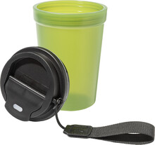 Jednostěnný cestovní kelímek z PP plastu s matnou povrchovou úpravou, víčkem na pití a poutkem z RPET polyesteru. 400 ml.
