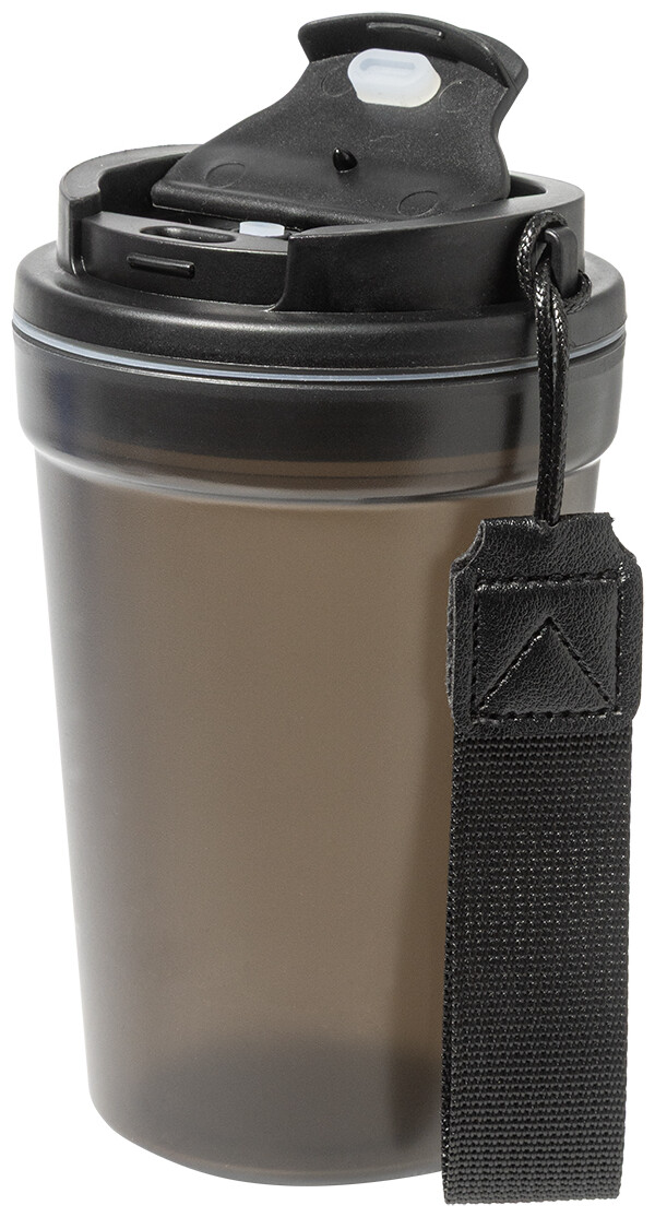 Jednostěnný cestovní kelímek z PP plastu s matnou povrchovou úpravou, víčkem na pití a poutkem z RPET polyesteru. 400 ml.