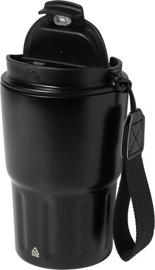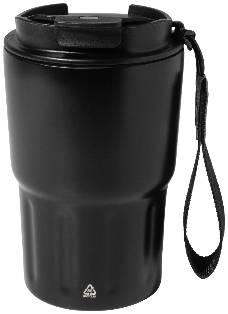 Dvoustěnný termo hrnek z recyklované nerezové oceli s izolačním víčkem z PP. S poutkem z RPET polyesteru. 350 ml.