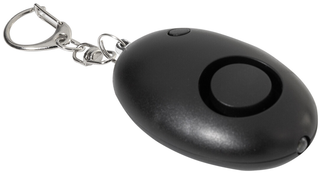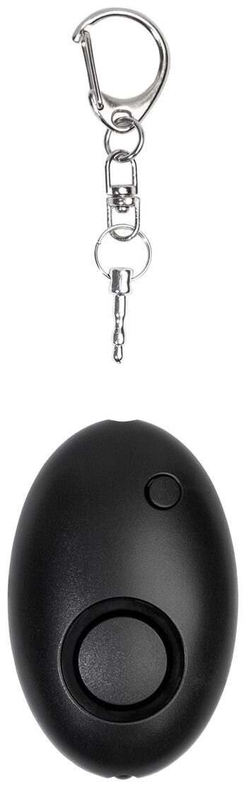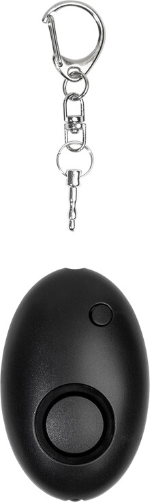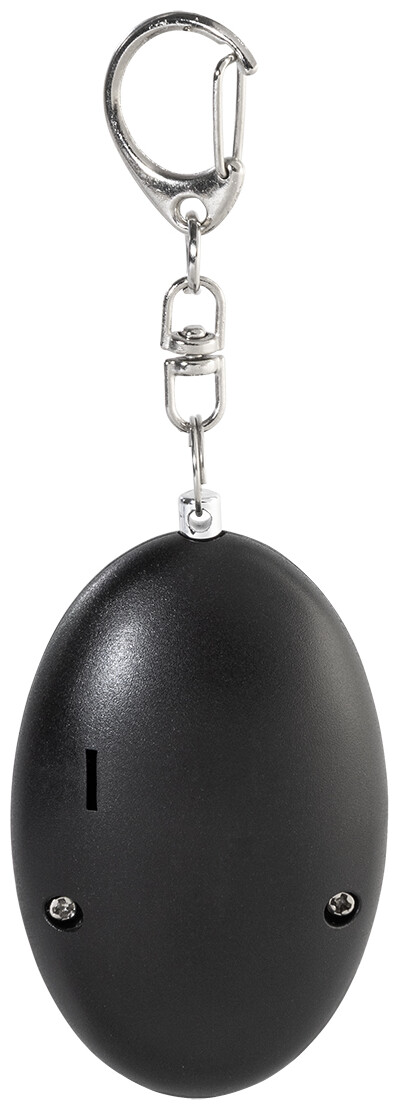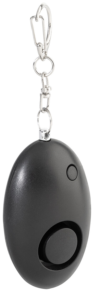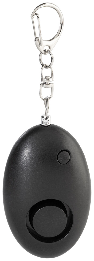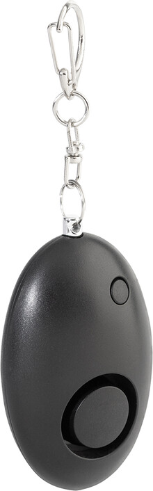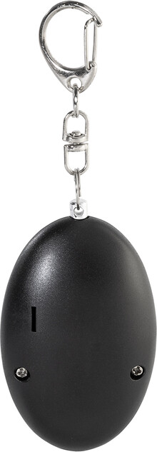 Osobní alarm z recyklovaného ABS materiálu s kovovou karabinou na klíče a 1 LED svítilnou. Alarm se aktivuje po zatažení za kolík. Hlasitost alarmu: cca 100 dB. S knoflíkovými bateriemi.