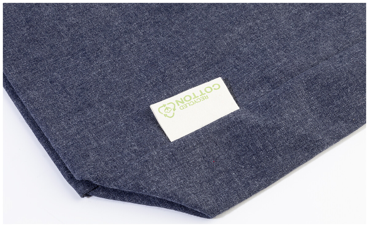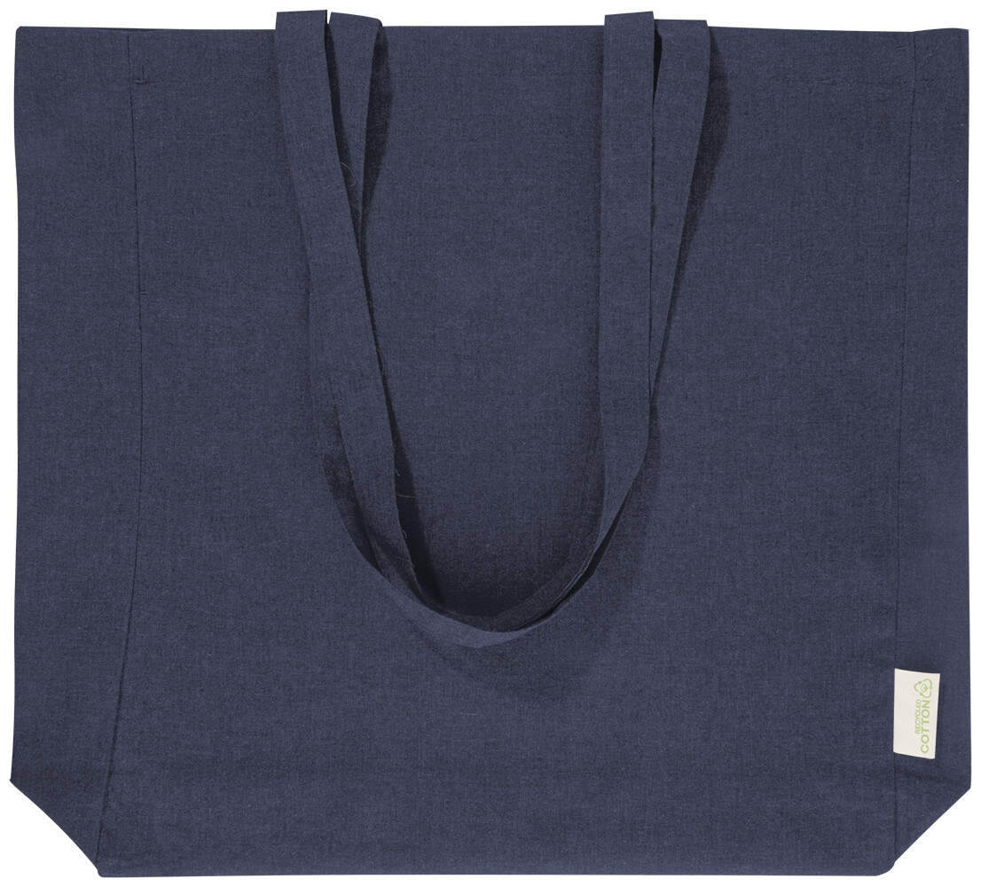 Nákupní taška s klínkem a dlouhými uchy ze 70 % recyklované bavlny a 30 % RPET polyesteru, 140 g/m2. S výraznou etiketou o recyklované bavlně.