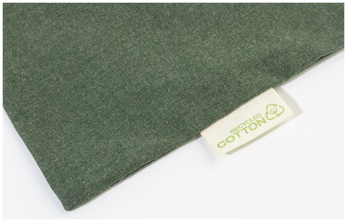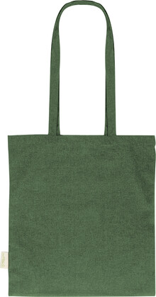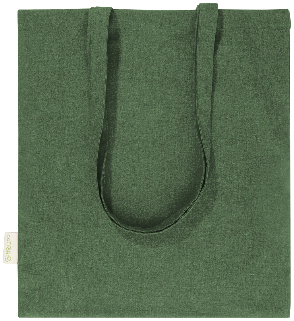 Nákupní taška s dlouhými uchy ze 70 % recyklované bavlny a 30 % RPET polyesteru, 140 g/m2. S výraznou etiketou o recyklované bavlně.