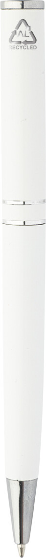 Kuličkové pero z recyklovaného hliníku s chromovanými částmi a kroužky. V černé dárkové krabičce. S modrou náplní.