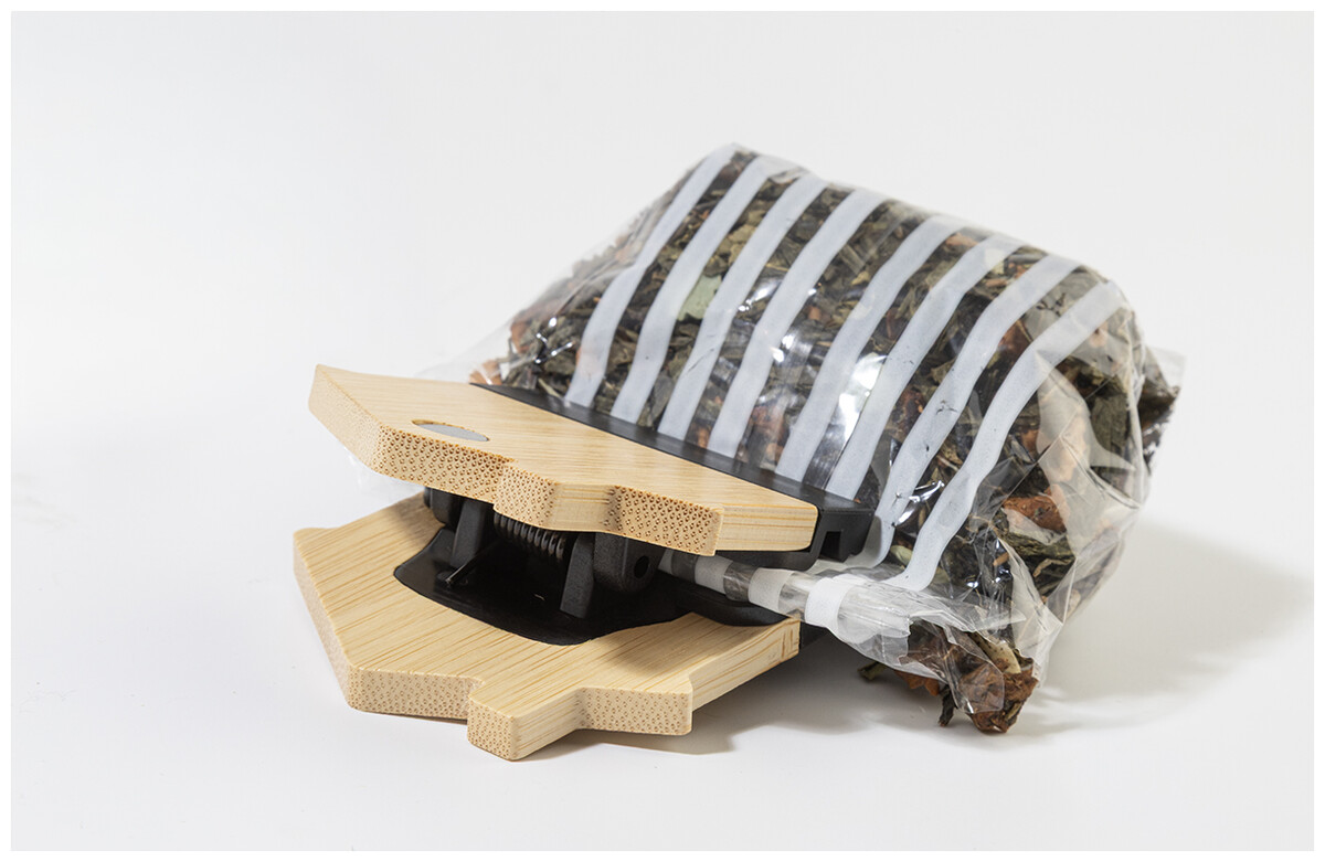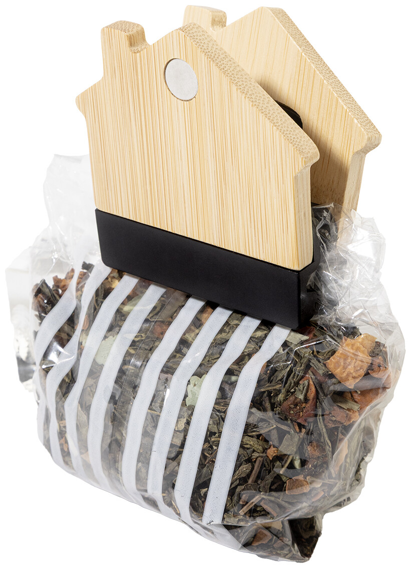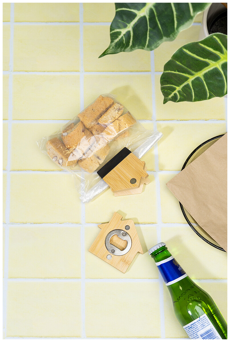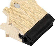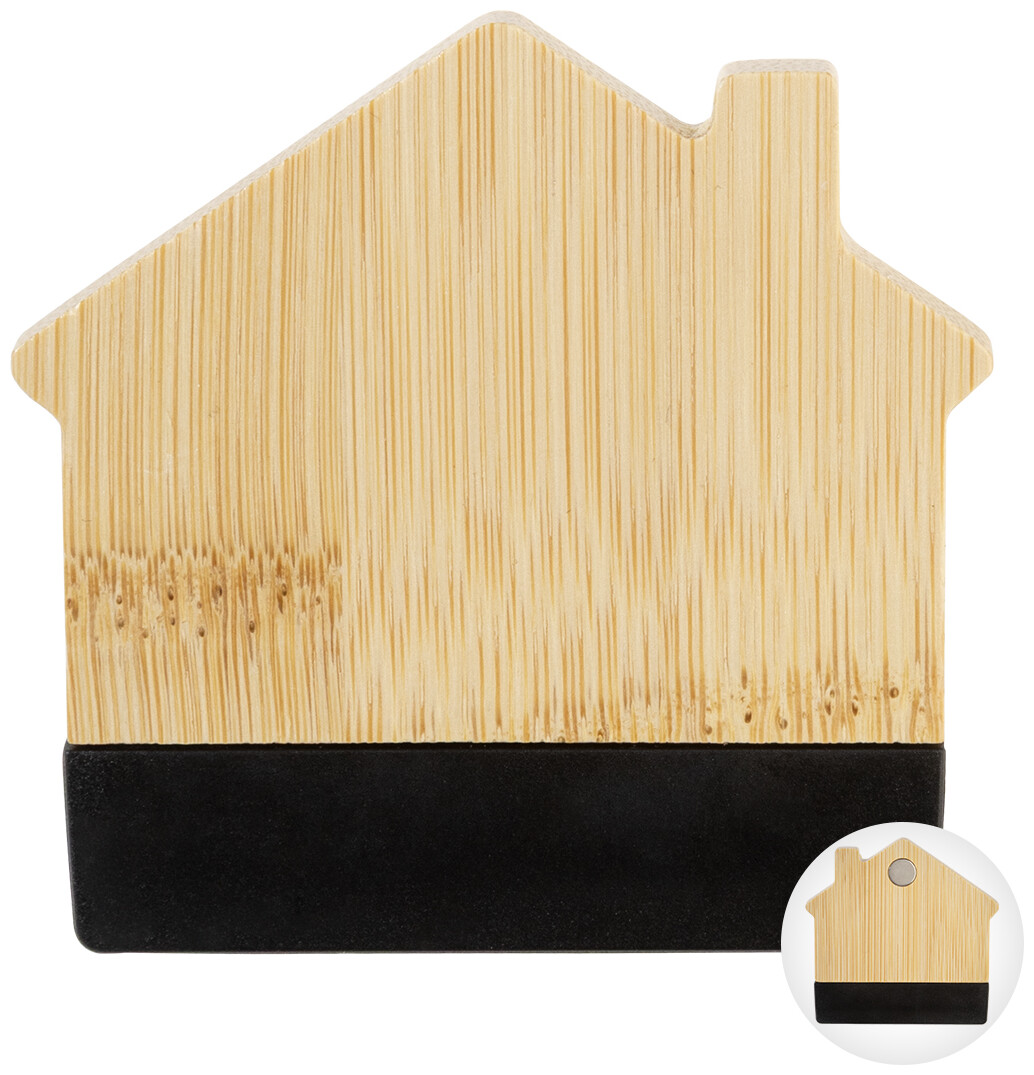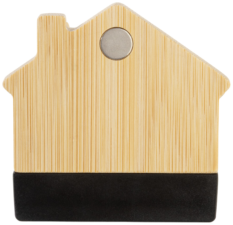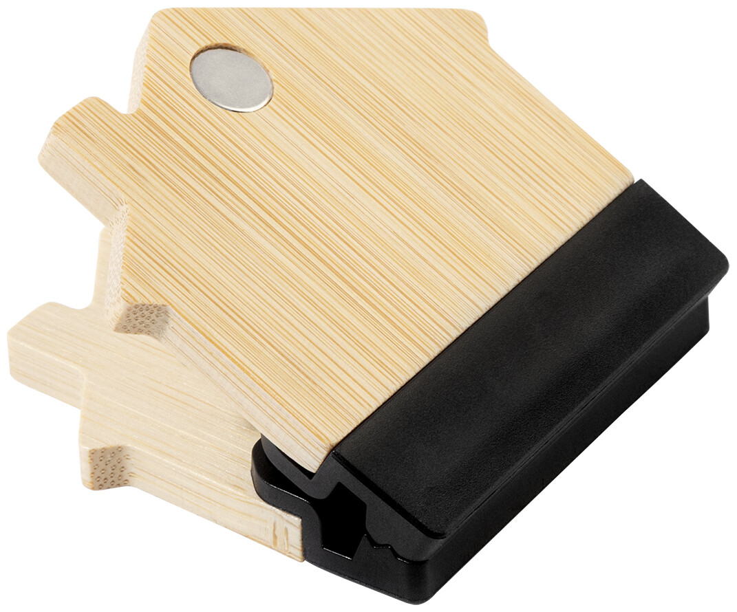 Bambusový magnet na ledničku ve tvaru domečku s klipem na poznámky. Slouží také jako klip na uzavírání sáčků.