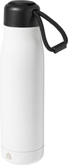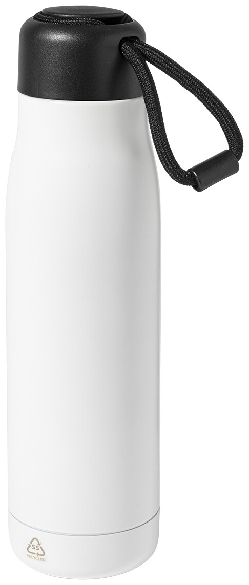 Dvoustěnná, vakuově izolovaná láhev z recyklované nerezové oceli s PP víčkem a integrovaným poutkem na nošení se šňůrkou. 500 ml.