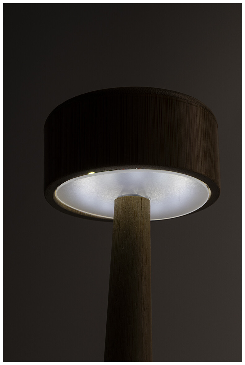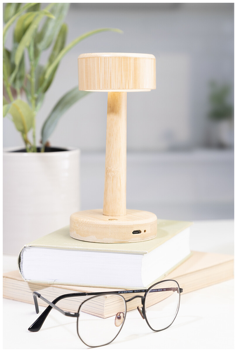 Bambusová stolní lampa s 24 LED diodami a 800 mAh dobíjecí baterií přes USB. S režimy teplého, přirozeného a studeného světla. Včetně nabíjecího kabelu USB.
