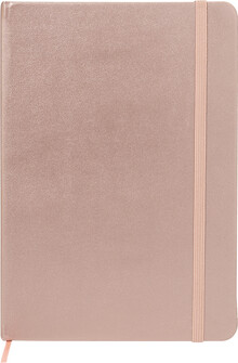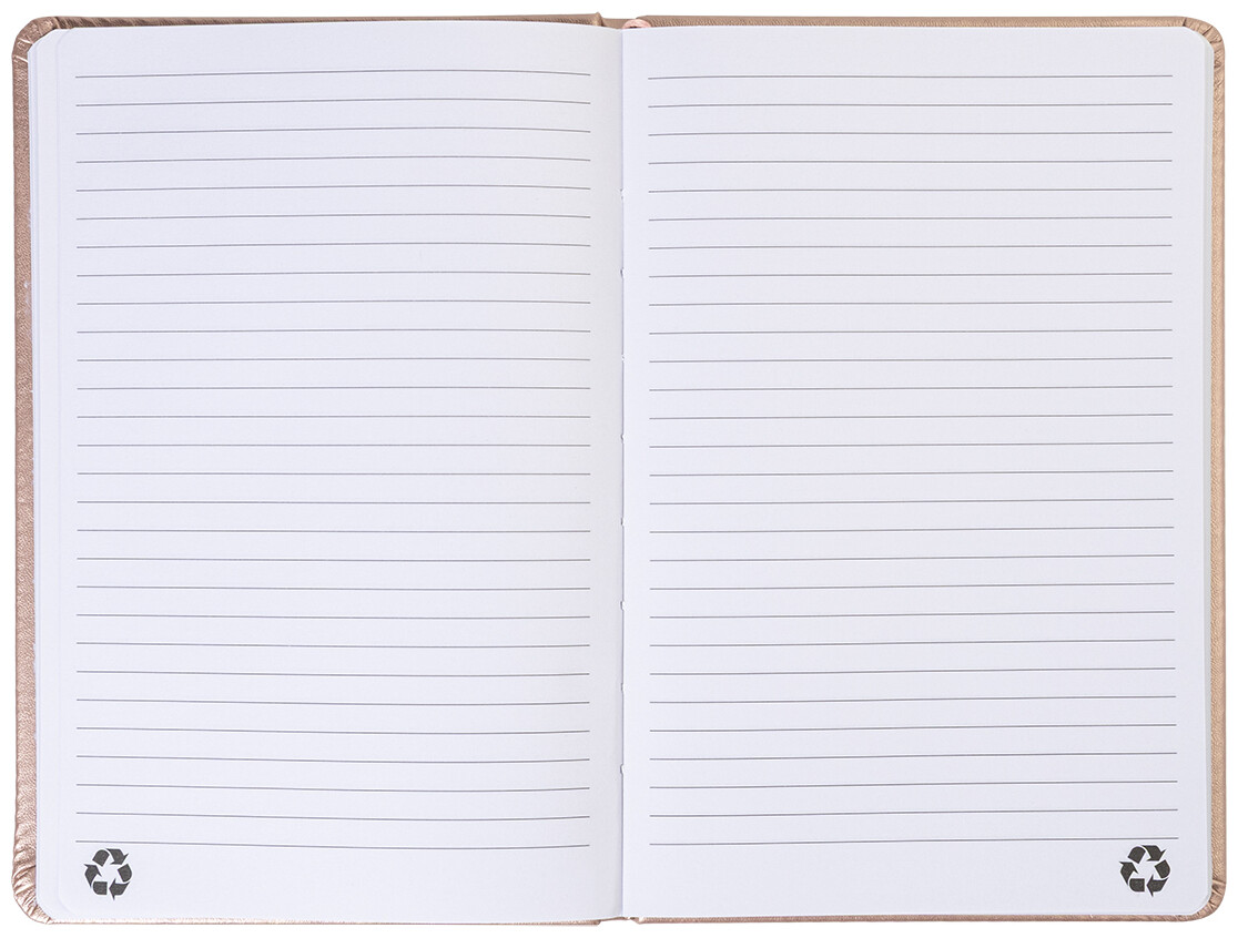 Blok A5 s potahem z recyklované PU kůže s metalickou úpravou se 100 linkovanými listy z recyklovaného papíru. S barevnou záložkou a gumičkou.