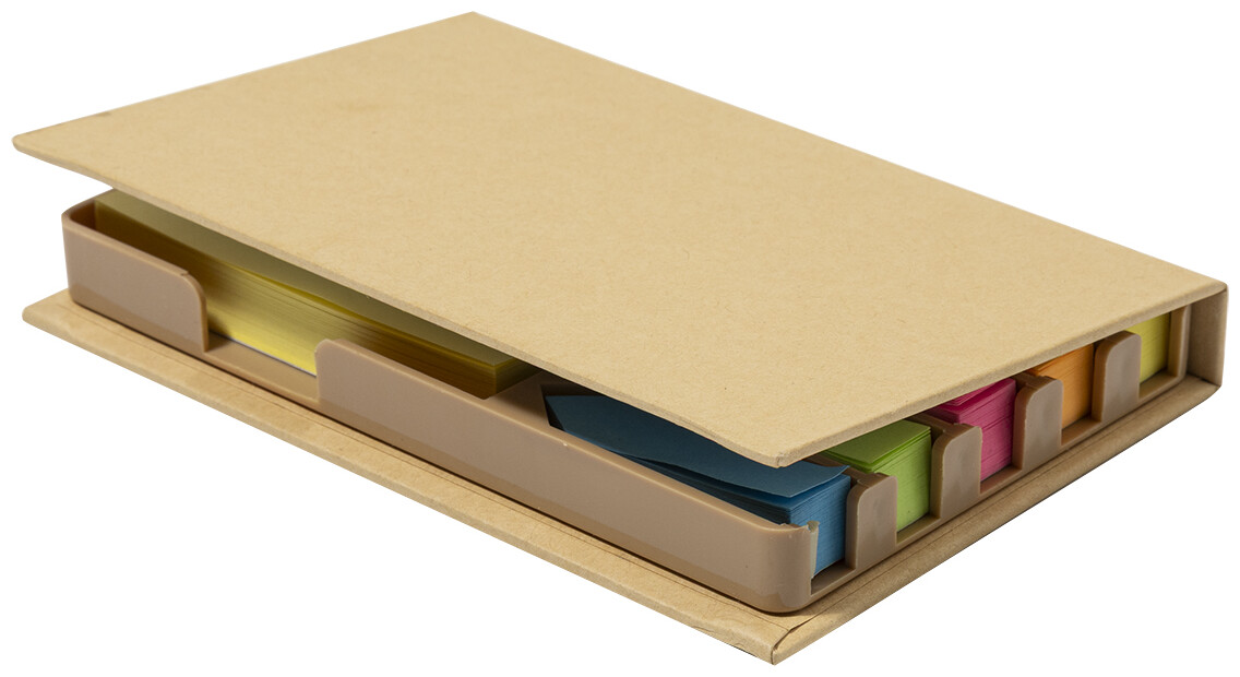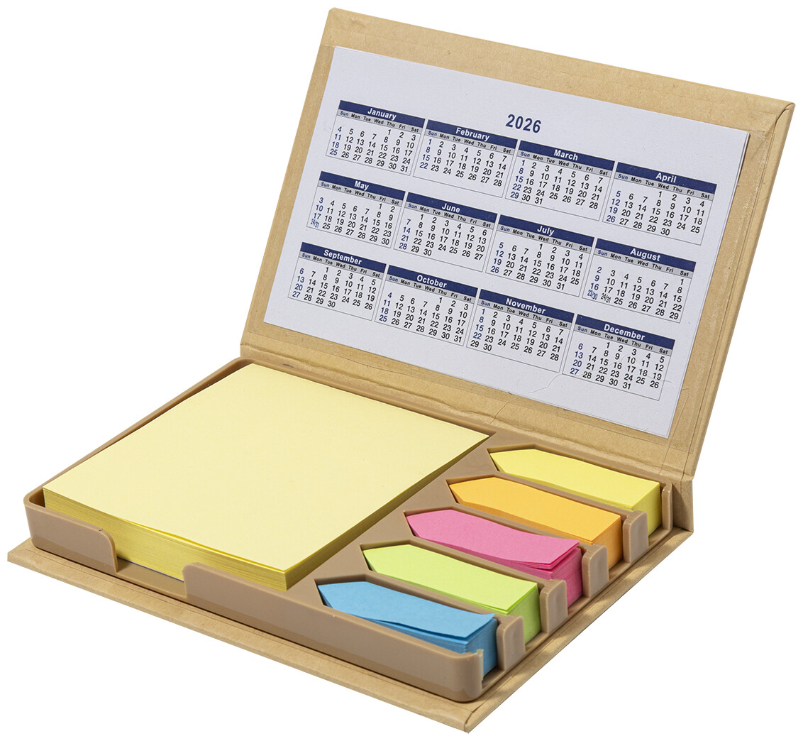 Samolepicí blok z recyklovaného papíru se 100 žlutými papírky na poznámky a 500 záložkami (v 5 barvách). Včetně kalendáře na 4 roky na vnitřní straně víka.