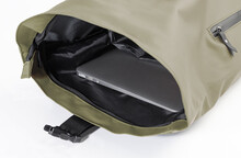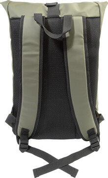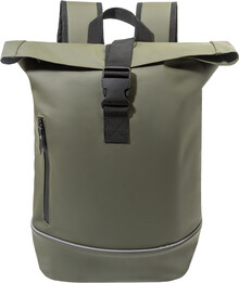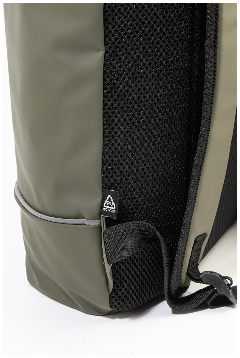 Voděodolný batoh s rolovacím vrškem z měkké recyklované PU kůže s hlavní přihrádkou na zip a zapínáním na přezku, přední kapsou s voděodolným zipem, polstrovanou přihrádkou na notebook (15") a reflexním proužkem. S polstrovanými zády a ramenními popruhy. S výraznou nálepkou z recyklované PU kůže.