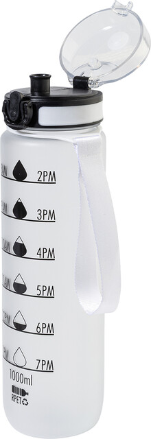 Sportovní láhev z matného RPET s motivačním objemovým a časovým značením, s automaticky otevíratelným odklápěcím víčkem s bezpečnostním zámkem a poutkem na nošení. 1000 ml. Bez BPA. Nevhodné pro sycené nápoje.