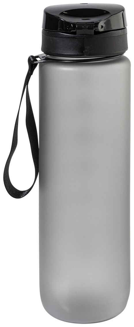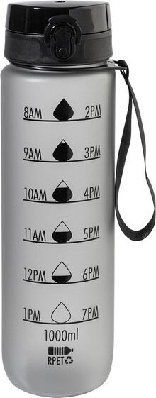 Sportovní láhev z matného RPET s motivačním objemovým a časovým značením, s automaticky otevíratelným odklápěcím víčkem s bezpečnostním zámkem a poutkem na nošení. 1000 ml. Bez BPA. Nevhodné pro sycené nápoje.