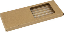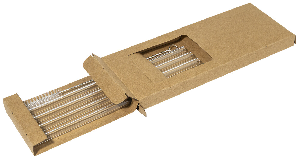 Sada 4 opakovaně použitelných brček na pití z borosilikátového skla s čisticím kartáčkem. V krabičce z kraftového papíru.