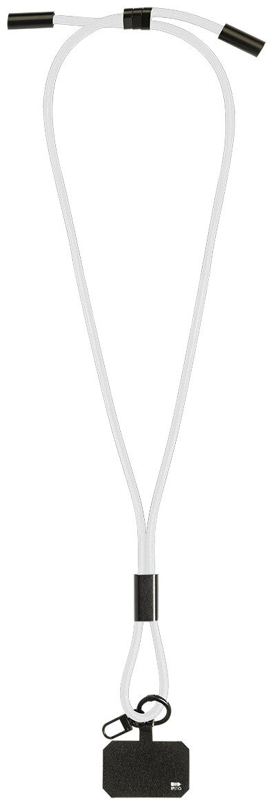 Šňůrka s držákem na mobil z RPET s vložkou pro telefon, karabinou a integrovaným nabíjecím kabelem USB-C na USB-C se skrytými konektory. Podporuje rychlé nabíjení a přenos dat PD 60W.