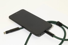 Šňůrka s držákem na mobil z RPET s vložkou pro telefon, karabinou a integrovaným nabíjecím kabelem USB-C na USB-C se skrytými konektory. Podporuje rychlé nabíjení a přenos dat PD 60W.