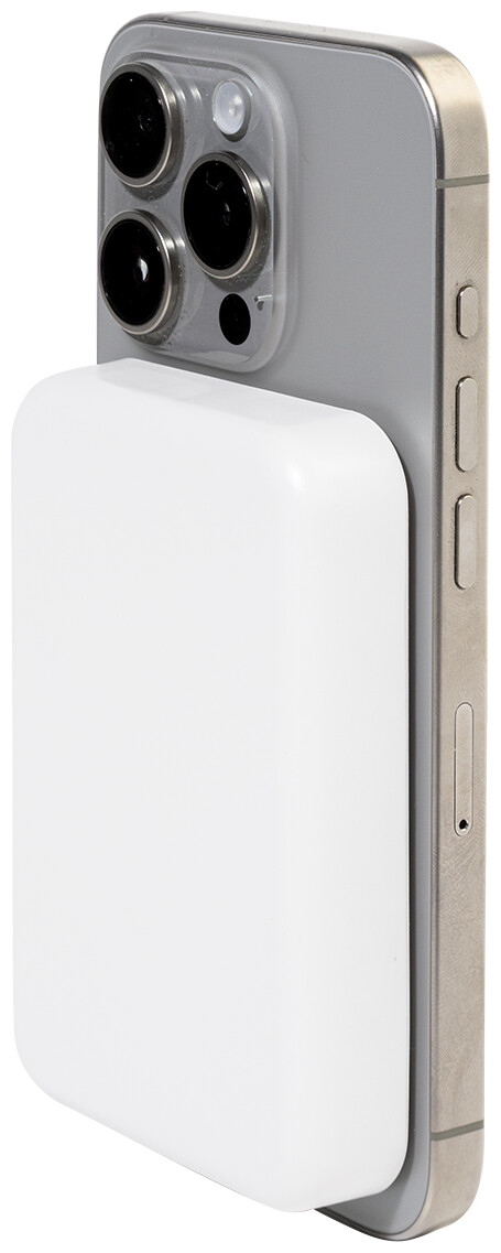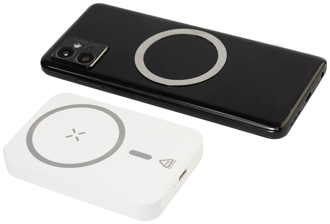 Power banka z recyklovaného ABS s baterií 5000 mAh a vestavěnou magnetickou bezdrátovou rychlonabíječkou (15 W). S USB-C vstupem a nabíjecím portem. Včetně samolepicího kovového kroužku pro použití magnetické funkce na jakémkoli bezdrátově nabíjecím zařízení. Kompatibilní s iPhone® 12 nebo novějším. Včetně nabíjecího kabelu USB.