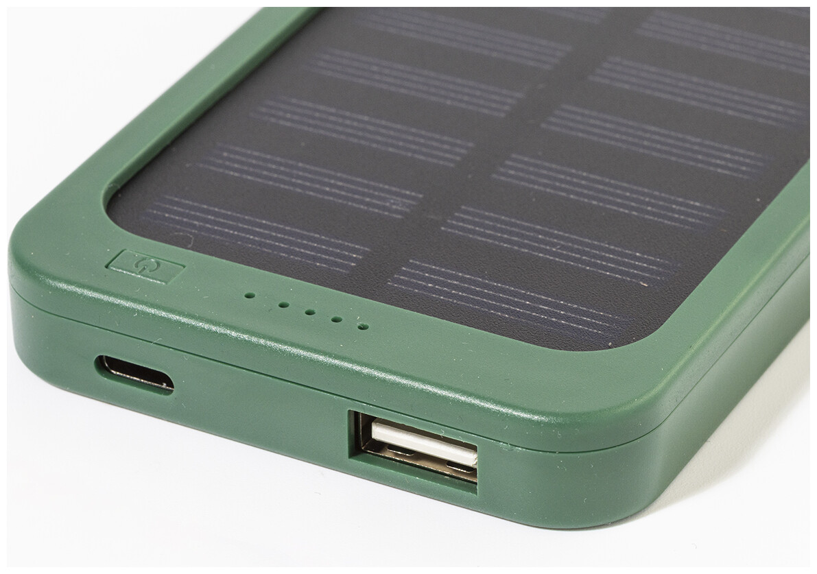 Power banka z recyklovaného ABS plastu s vestavěnou solární nabíječkou a baterií 4000 mAh. S 1 USB a 1 USB-C portem pro nabíjení. Vstupní port USB-C. Včetně nabíjecího kabelu USB.