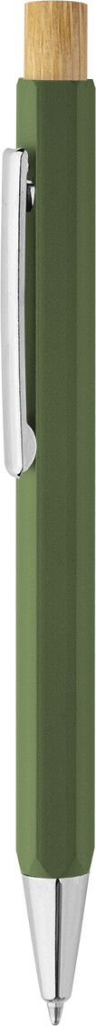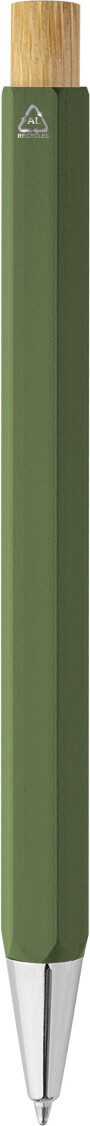Šestihranné kuličkové pero z recyklovaného hliníku s bambusovým tlačítkem a chromovanými částmi. S modrou náplní.