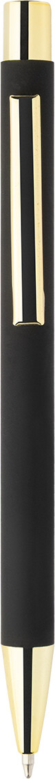 Kuličkové pero z recyklovaného hliníku s černým pogumovaným tělem a barevnými lesklými kovovými částmi. Se speciálním povrchem pro zrcadlové gravírování, které ladí s kovovými částmi. S modrou náplní.