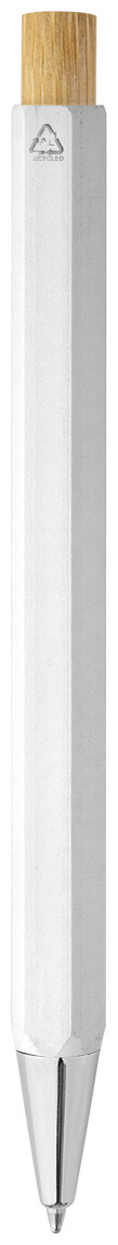 Šestihranné kuličkové pero z recyklovaného hliníku s bambusovým tlačítkem a chromovanými částmi. S modrou náplní.