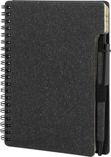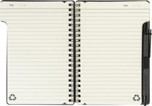 Spirálový blok A6 z recyklovaného papíru s 80 linkovanými listy. Včetně recyklovaného papíru a kuličkového pera z recyklovaného PP s modrou náplní.