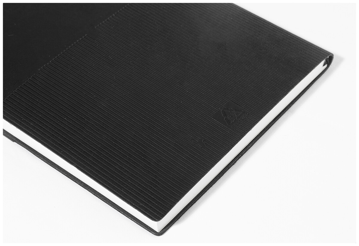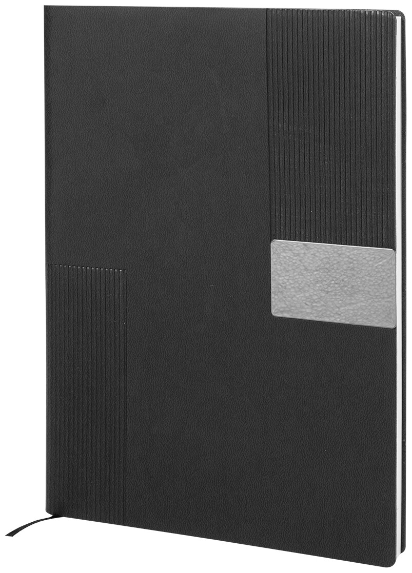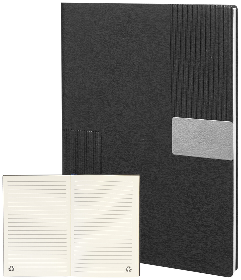 Blok A5 s recyklovanou PU kůží s pruhovanou dekorací a kovovou destičkou pro logo. Se záložkou a 80 linkovanými listy z recyklovaného papíru.