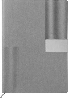 Blok A5 s recyklovanou PU kůží s pruhovanou dekorací a kovovou destičkou pro logo. Se záložkou a 80 linkovanými listy z recyklovaného papíru.