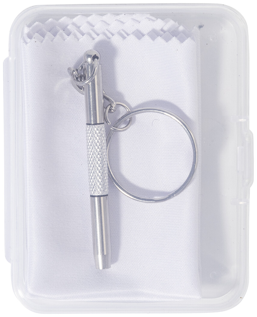 Kompaktní sada na opravu brýlí v průhledné PP krabičce. Včetně čisticího hadříku ze 100% RPET mikrovlákna (220 g/m2) a mini šroubováku s klíčenkou. Rozměr hadříku: 18×15 cm.