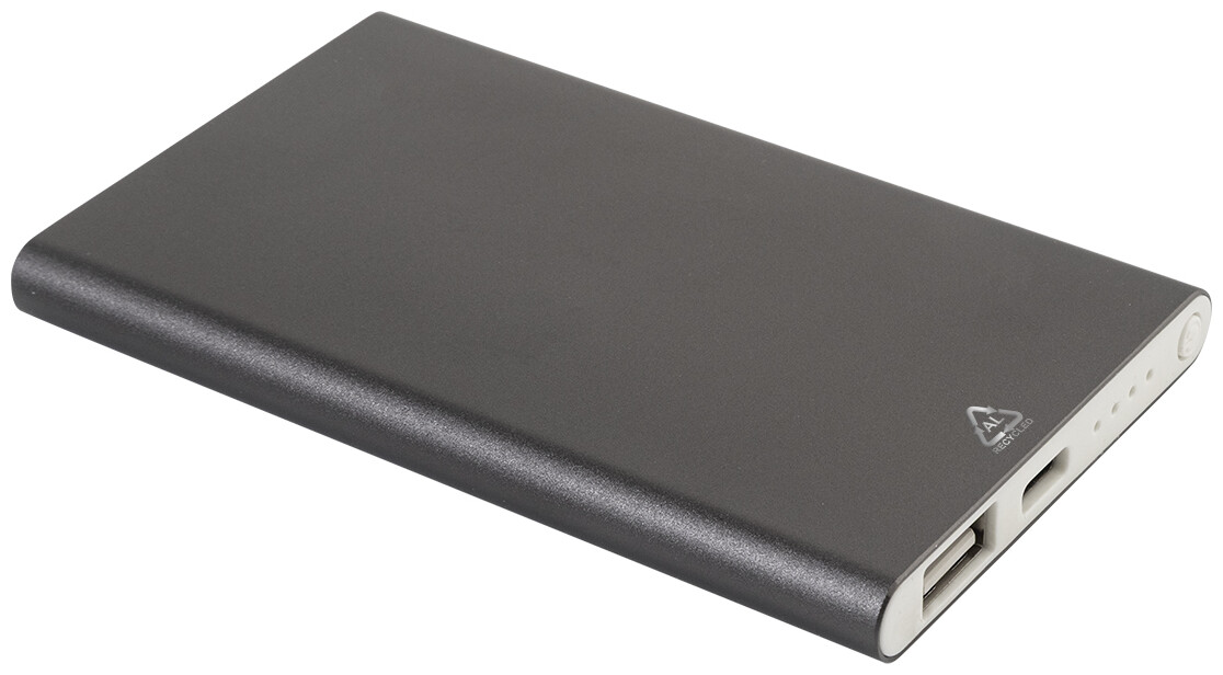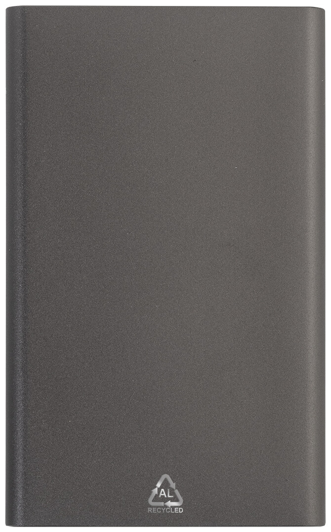 USB power banka v pouzdře z recyklovaného hliníku s 4000 mAh baterií. S 1 portem USB a 1 portem USB-C pro nabíječku. Vstupní port USB-C. Včetně USB nabíjecího kabelu.