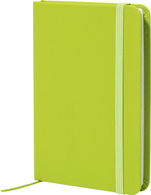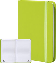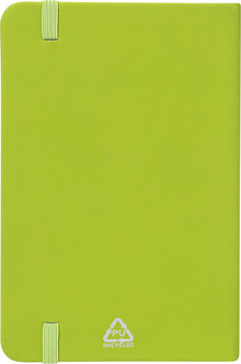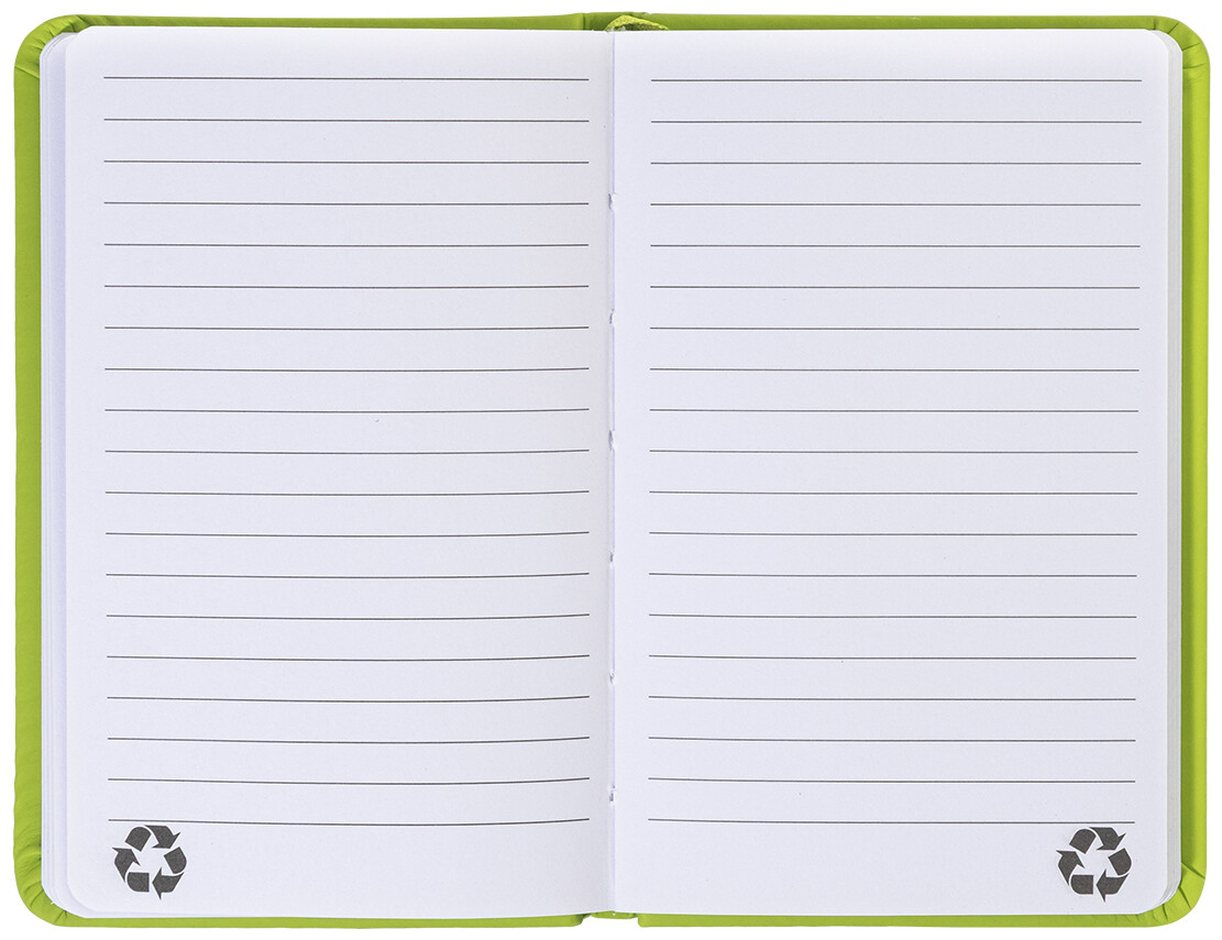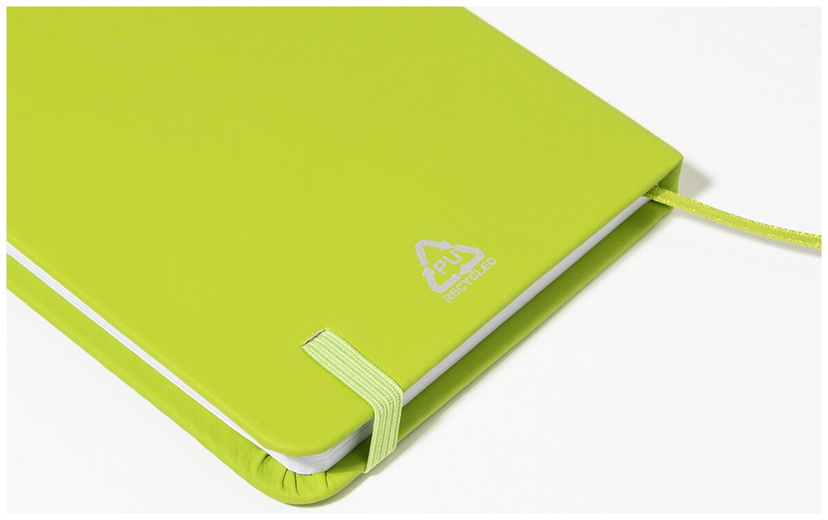 Blok potažený recyklovanou PU kůží se 100 linkovanými listy z recyklovaného papíru. Se záložkou v odpovídající barvě a gumičkou. Velikost A6.