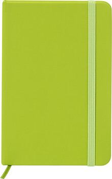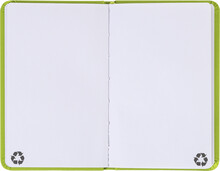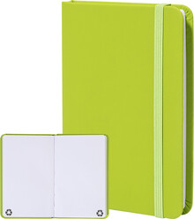 Blok A6 z recyklované PU kůže se 100 čistými listy z recyklovaného papíru. Se záložkou v odpovídající barvě a gumičkou.