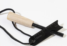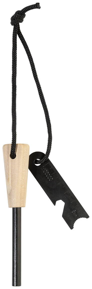 Nářadí na zapalování ohně pro přežití s dřevěnou rukojetí a multifunkční škrabkou z nerezové oceli, vybavené pravítkem, otvírákem na lahve a imbusovým klíčem.