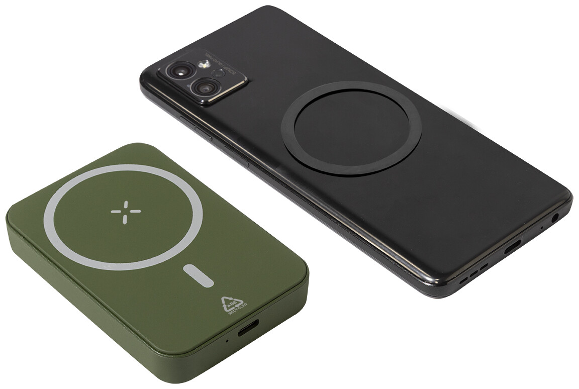 Power banka z recyklovaného ABS s 5000 mAh baterií a vestavěnou magnetickou bezdrátovou nabíječkou (5W). Se vstupem USB-C a portem pro nabíječku. Včetně samolepícího kovového kroužku pro použití magnetické funkce na jakémkoli bezdrátově nabíjecím zařízení. Kompatibilní s iPhone® 12 nebo novějším. Včetně USB nabíjecího kabelu.