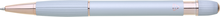 Propiska z recyklovaného hliníku se soft povrchem a doplňky v růžovo-zlaté barvě. Laserované logo je lesklé, růžovo-zlaté. Náplň modře píšící. Výsledný efekt laserového značení je lesklý, v barvě doplňků.
