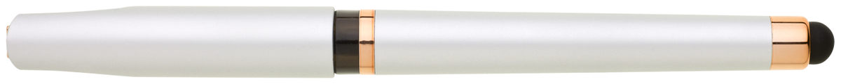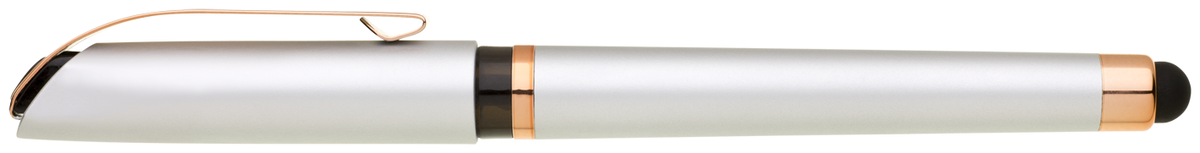 Gelová propiska s s víčkem a touch koncem, soft povrch a doplňky v růžovo-zlaté barvě. Náplň gelová velkokapacitní modře píšící.